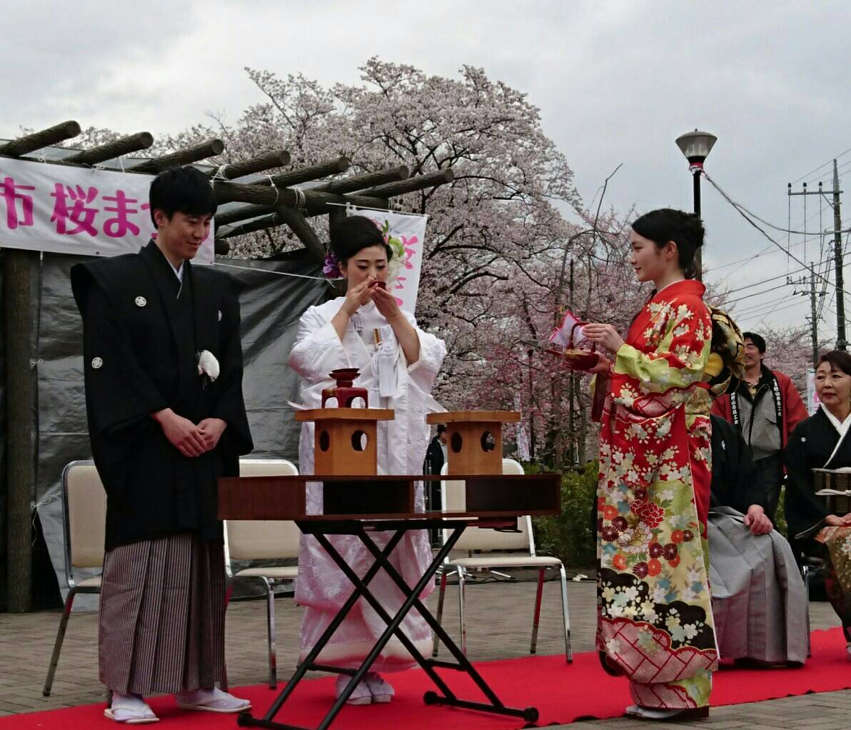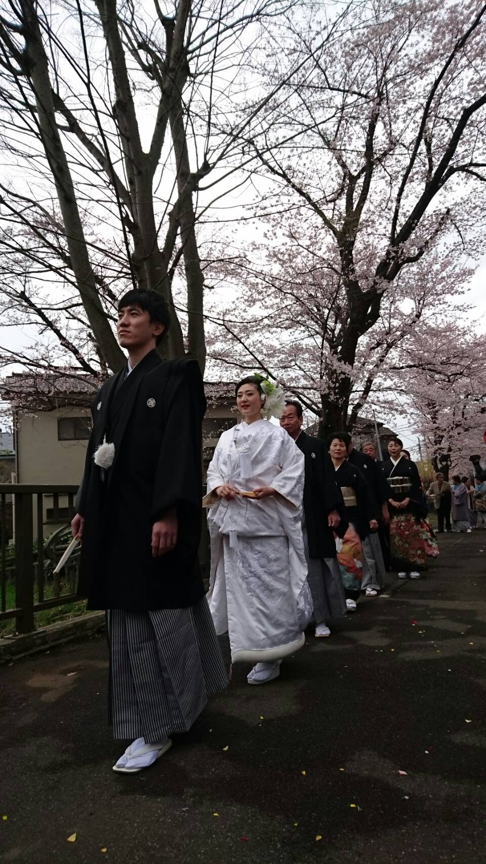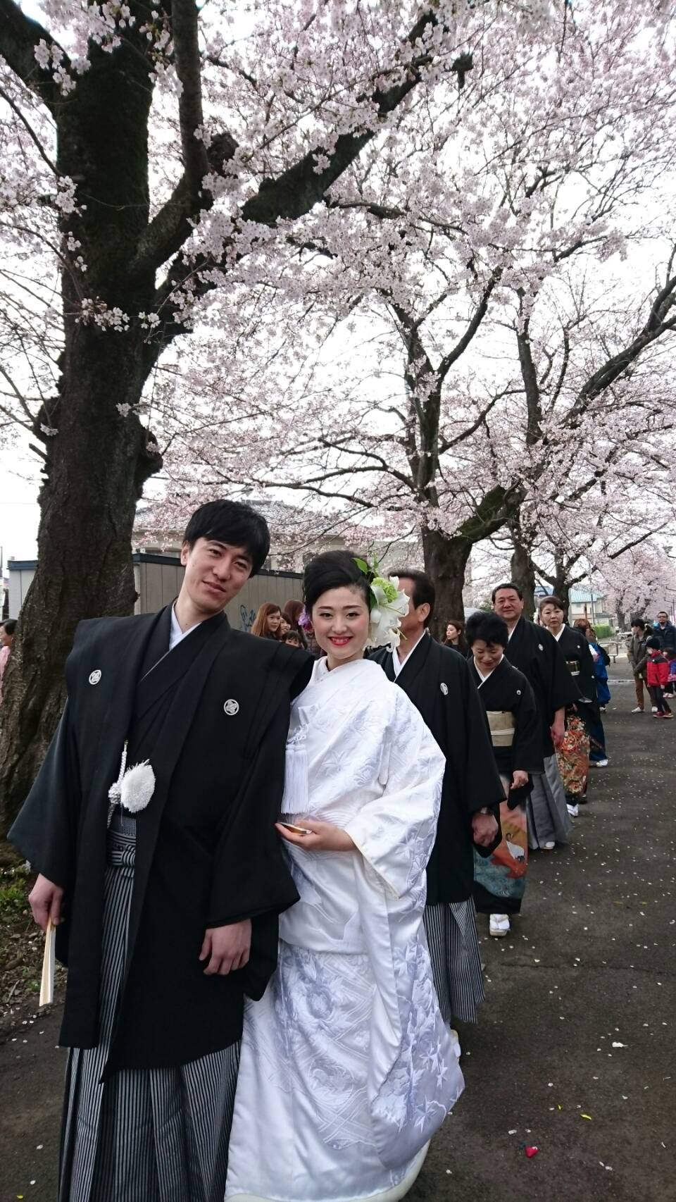 桜並木を歩く新郎新婦はとても幸せそうでした!