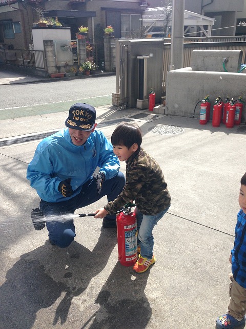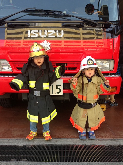 消防服に着替えて消防隊になりきっています。