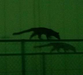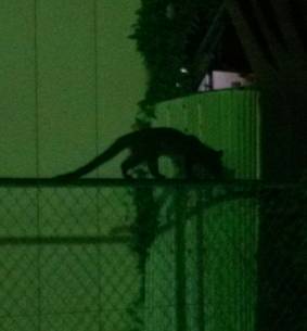 長い尾をフリフリさせながらバランスを取り細いフェンスの上を歩いていました。