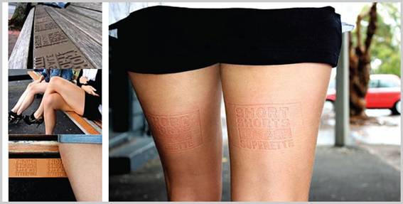 ベンチに文字を掘り込み、座った人の太ももにその彫った文字を残す広告ですね。