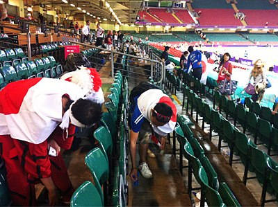 サッカー日韓戦後のスタンド、グランド内では催し物が行われていた間、日本人サポーターは自分達のエリア周辺のゴミをもくもくと清掃していたそうです。