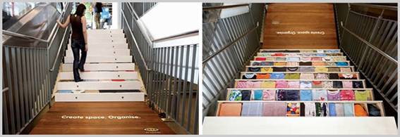 これは階段ですが、タンスのように洋服が収納されているように見せています。