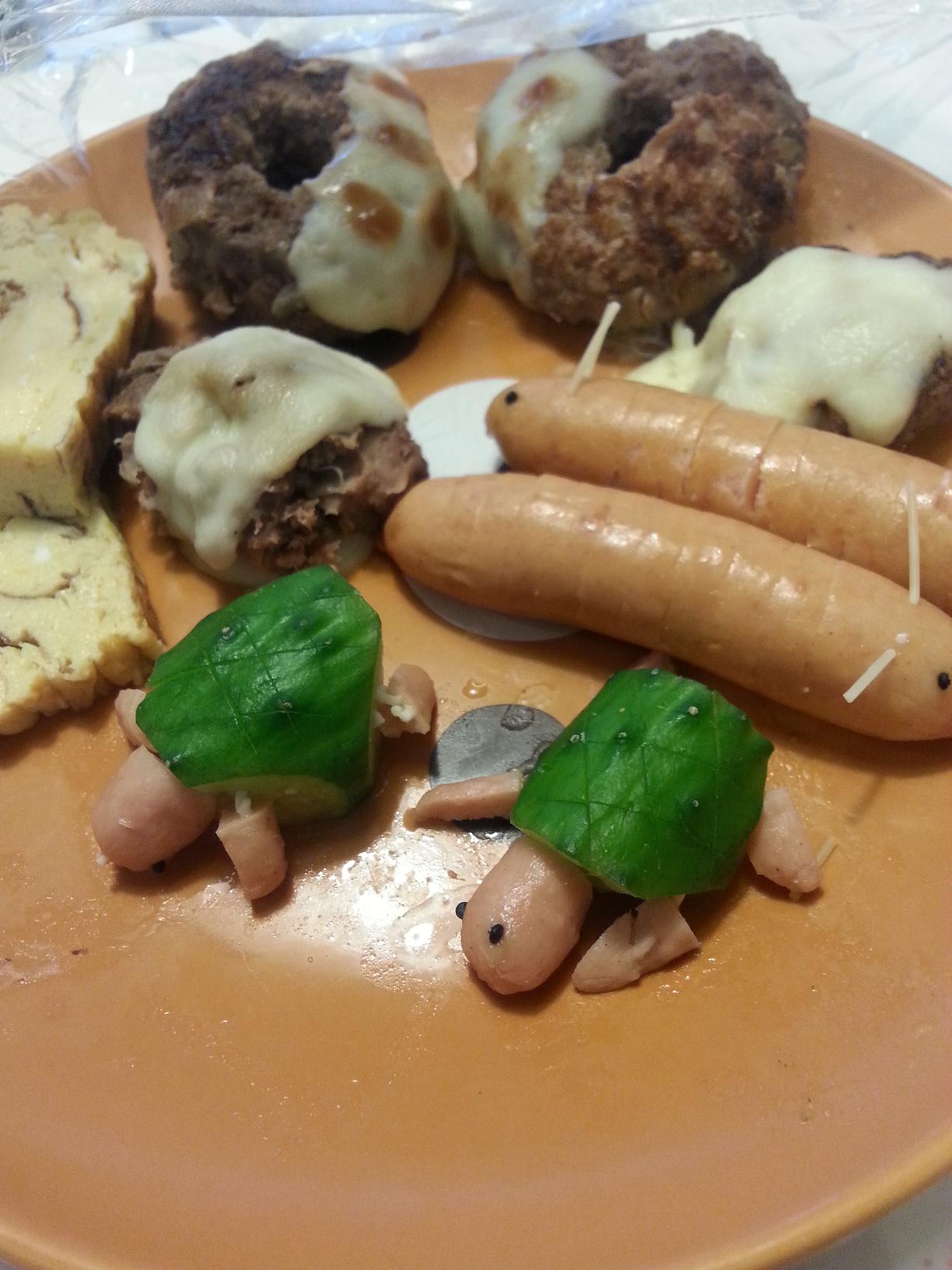 ドーナツの形をしたハンバーグ。芋虫のソーセージ。