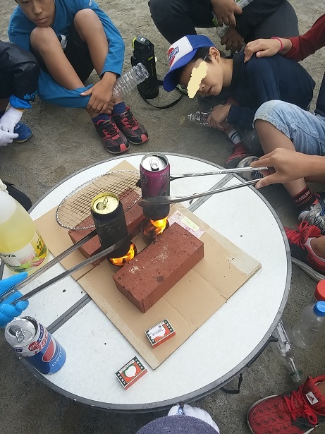 まず、空き缶にティッシュと油を入れマッチで火を付けます。